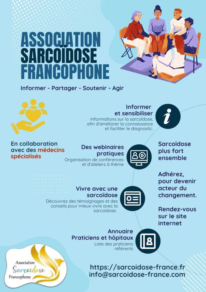 L’ASF est une association à but non lucratif qui rassemble les personnes touchées par la sarcoïdose ainsi que leurs proches. Elle œuvre pour informer en facilitant l’accès à des ressources fiables : documentation, contacts médicaux, hôpitaux spécialisés, événements et temps d’échange. L’association contribue également à faire connaître la maladie auprès du grand public et des professionnels de santé, afin de favoriser un diagnostic plus rapide, une meilleure prise en charge et une compréhension plus humaine du quotidien des personnes concernées.
